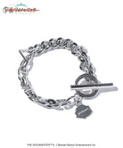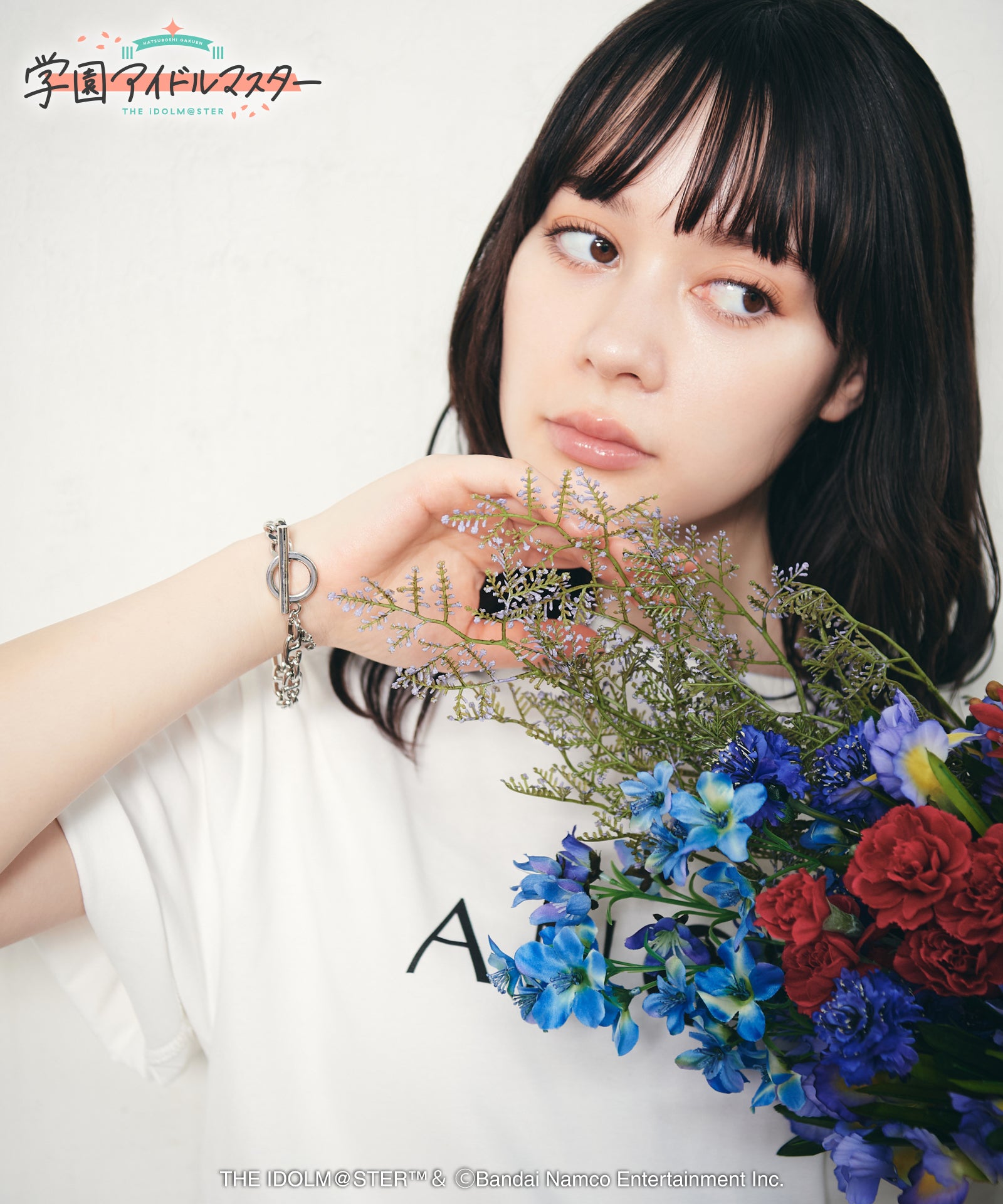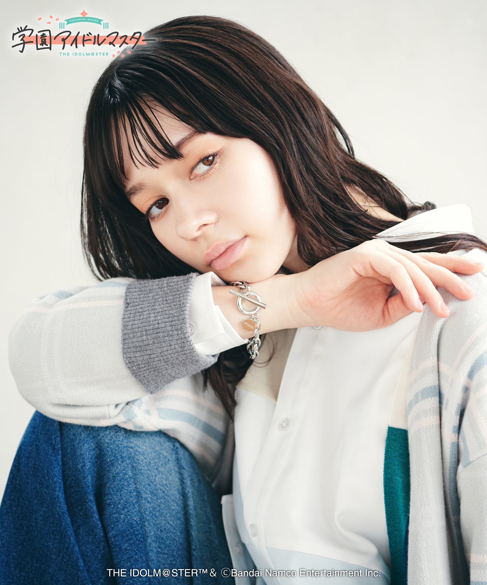 gladgarbと『学園アイドルマスター』がコラボレーション。月村手毬のエッセンスを手元にまとわせるTemari Bracelet。2種類のチェーンを用いたアシンメトリーなボディは、片側は専用楽曲『アイヴイ』の衣装で月村手毬が着用するブレスレットの形状。もう片側はgladgarbのイニシャルとなる「g」をかたどった形状で、コラボレーションならではのヴィジュアルとなっております。2つを結ぶ三角のパーツはベーシックコスチュームのパーツや月村手毬のイヤリングをイメージしたもの。チャームには彼女が愛用する「ハリネズミゆたんぽ」のシルエットを象りました。