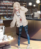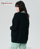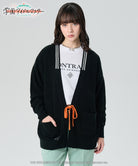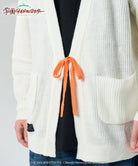 . The ribbed neck line is inspired by her hairpin. The pattern on the cuffs is cable-like knitted fabric, the placket is all-needle knitted, the body and arms are single-ridge knitted, and the cuffs and hem are ribbed and have a variety of deep textures unique to knitting.HIRO SHINOZAWAIt expresses the appearance of The orange ribbon seen on the blouse worn in the story is used as an accent in the front. The loose silhouette combines drop shoulders and a long length to create an ennui mood.