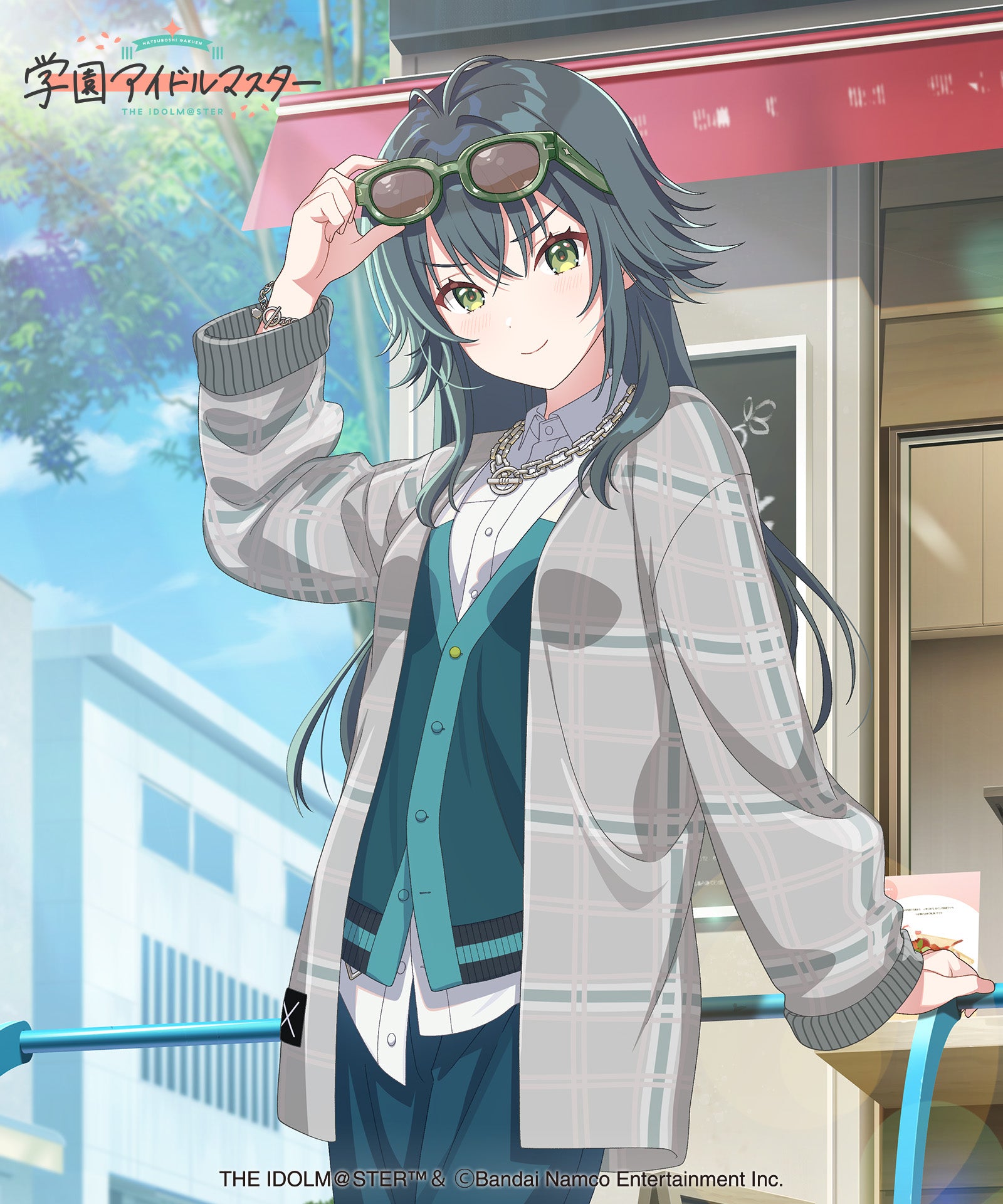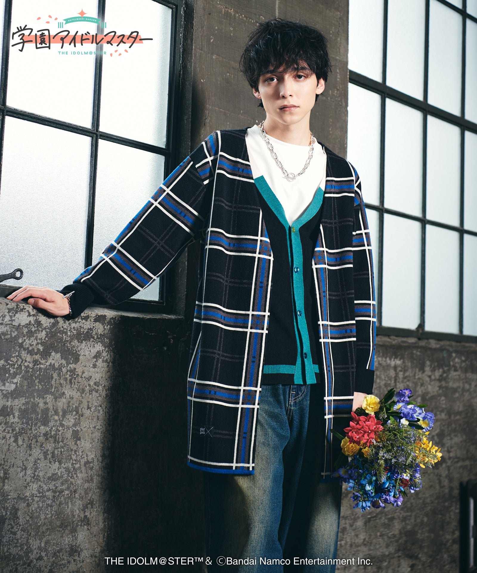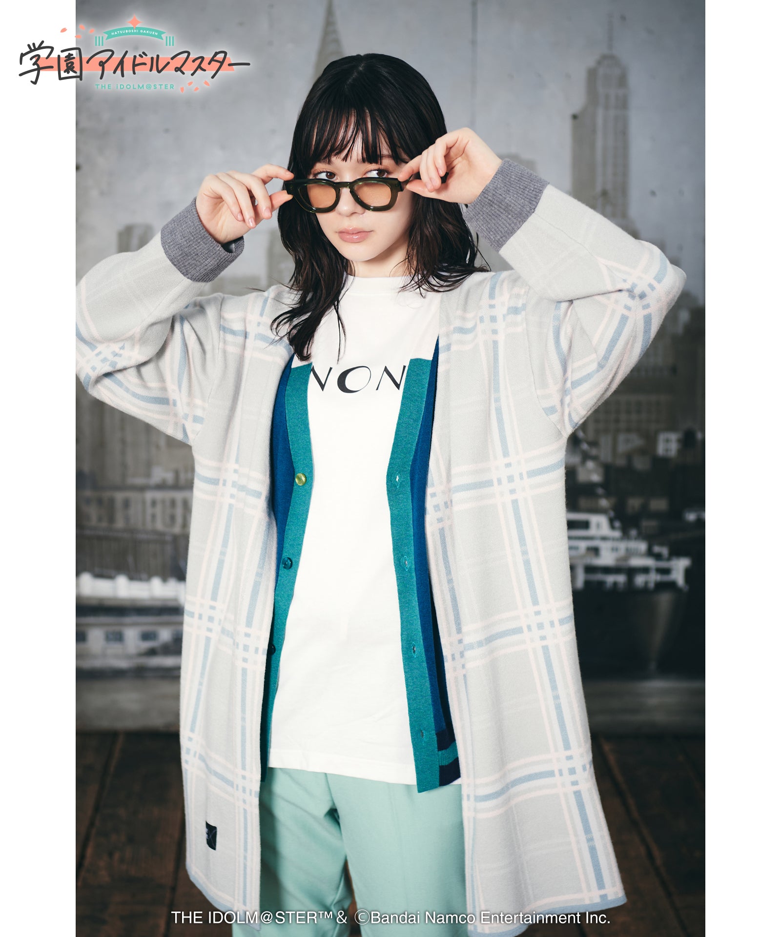 gladgarb and ``GAKUENTHE IDOLM@STER” is a collaboration. Temari Cardigan combines Temari Tsukimura's personal clothes into a single piece of knitwear. The appearance of a polo shirt and long jacket is created with faux layering on the front. Tsukimura Temari's style of rolling up his arms is expressed by the ribbing on the cuffs. Furthermore, the inner collar, first button, and color scheme of the skirt are also reproduced. The large-sized plaid pattern gives it a contemporary look.
